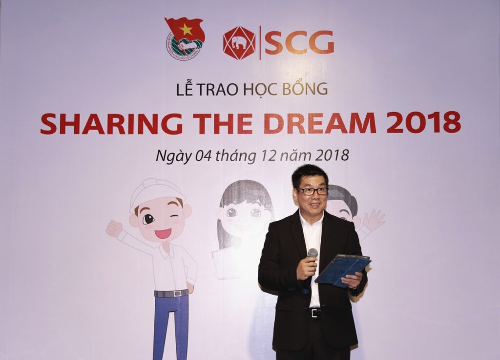 Ông Sompob Witworrasakul – Tổng giám đốc Công ty TNHH Giấy Kraft Vina – Công ty thành viên của tập đoàn SCG – phát biểu trong lễ trao học bổng: “Một trong những trọng tâm của SCG là hỗ trợ sự phát triển con người, đặc biệt trong lĩnh vực giáo dục. Chúng tôi tin rằng giáo dục không những là nền tảng cho sự phát triển của một cá nhân mà còn quyết định tương lai của một quốc gia. Vì vậy, SCG đã khởi xướng chương trình học bổng Sharing The Dream nhằm truyền động lực cho các bạn sinh viên nhiệt huyết kiến tạo tương lai tươi sáng thông qua giáo dục”.